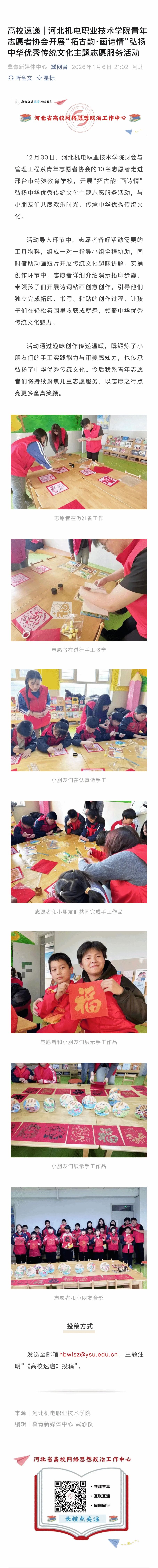 近期,我系青年志愿者协会开展的“拓古韵·画诗情”弘扬中华优秀传统文化主题志愿服务活动取得良好成效,活动事迹被河北省高校网络思想政治工作中心冀网育公众号报道。活动中,我系志愿者走进邢台市特殊教育学校,以诗词贴画创意创作为载体,带领孩子们沉浸式体验传统文化魅力。