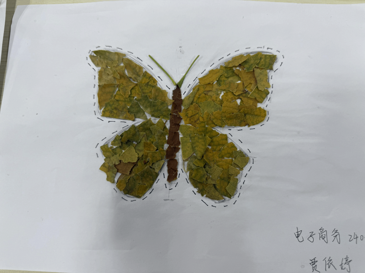 活动中,同学们热情参与,用捡拾的斑斓树叶堆叠出独属于秋的创意作品。有黄绿叶片拼缀的蝴蝶,翅翼舒展似载着秋光翩跹;有红褐叶片叠塑的凤凰,尾羽张扬如燃着秋日炽焰;有彩叶勾勒的别致帽子,纹理间藏着秋的细腻心思;更有叶片组合而成的人物剪影,姿态悠然似与秋景深情对望。每一件作品都凝结着与秋的默契。