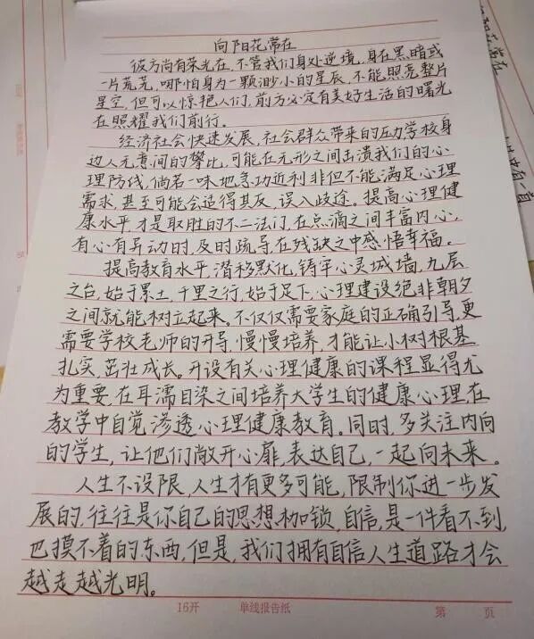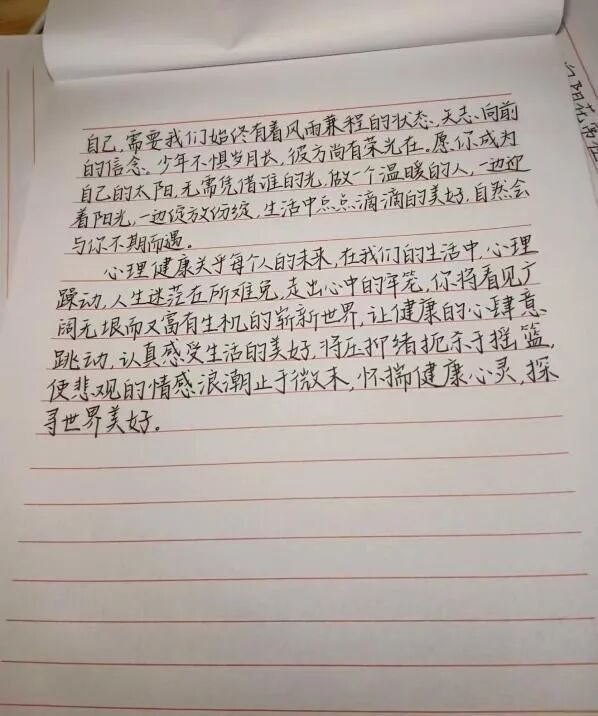 活动中,同学们全神贯注地投入创作,用文字记录下自己对阳光心灵的理解和感悟。有的同学分享了面对学业压力时的自我调节方法;有的同学讲述了如何走出情绪低谷的真实经历;还有的同学通过散文的形式表达了对生命价值的思考。